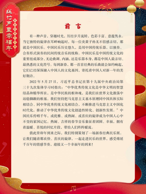2022年5月27日,习近平总书记在第十九届中央政治局第三十九次集体学习时指出:“中华优秀传统文化是中华文明的智慧结晶和精华所在,是中华民族的根和魂,是我们在世界文化激荡中站稳脚跟的根基。我们坚持把马克思主义基本原理同中国具体实际相结合、同中华优秀传统文化相结合,不断推进马克思主义中国化时代化,推动了中华优秀传统文化创造性转化、创新性发展。”中国民乐传唱千年,或优雅、或热闹、或喜庆的旋律成为中国人心中不变的家国记忆。热闹、吉祥的春节音乐象征着团圆、幸福,拥有着温暖、喜悦的回忆片段,带给人们阵阵暖流。