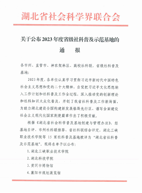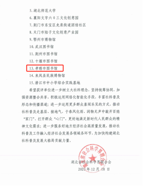 根据《湖北省社会科学普及基地创建与管理办法》,经过基地自评、市州社科联推荐、省社科联综合评定等流程,孝感市图书馆等15家社科普及基地近期获评“湖北省社科普及示范基地”。