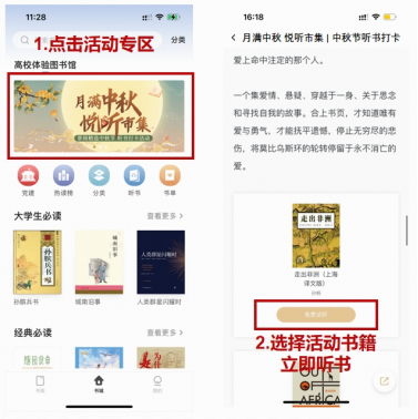进入书城首页,找到中秋活动专区,选择有声书籍,点击“立即阅读”后听指定书籍即可。(注:活动专区外的其它有声书不计入活动时长。)