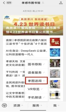 关注“孝感市图书馆”微信公众号,点击服务-孝图送阅-我的绑定读者证即可享受借书服务。