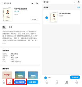 (1)点击选好的书籍进入详情,点击加入借书架,选择完毕后,点击借书架,勾选需要借阅的书籍,点击立即借阅。