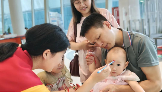 来自湖北工程学院新技术学院“田强”志愿服务队信息工程系分队的大学生志愿者手持毛笔,蘸取加有雄黄酒象征驱邪避毒的红色朱砂,轻轻点在孩童额头上,这一承载千年祝福的古礼,让家长与孩子们在亲身体验中理解了“点额驱毒”的美好寓意。